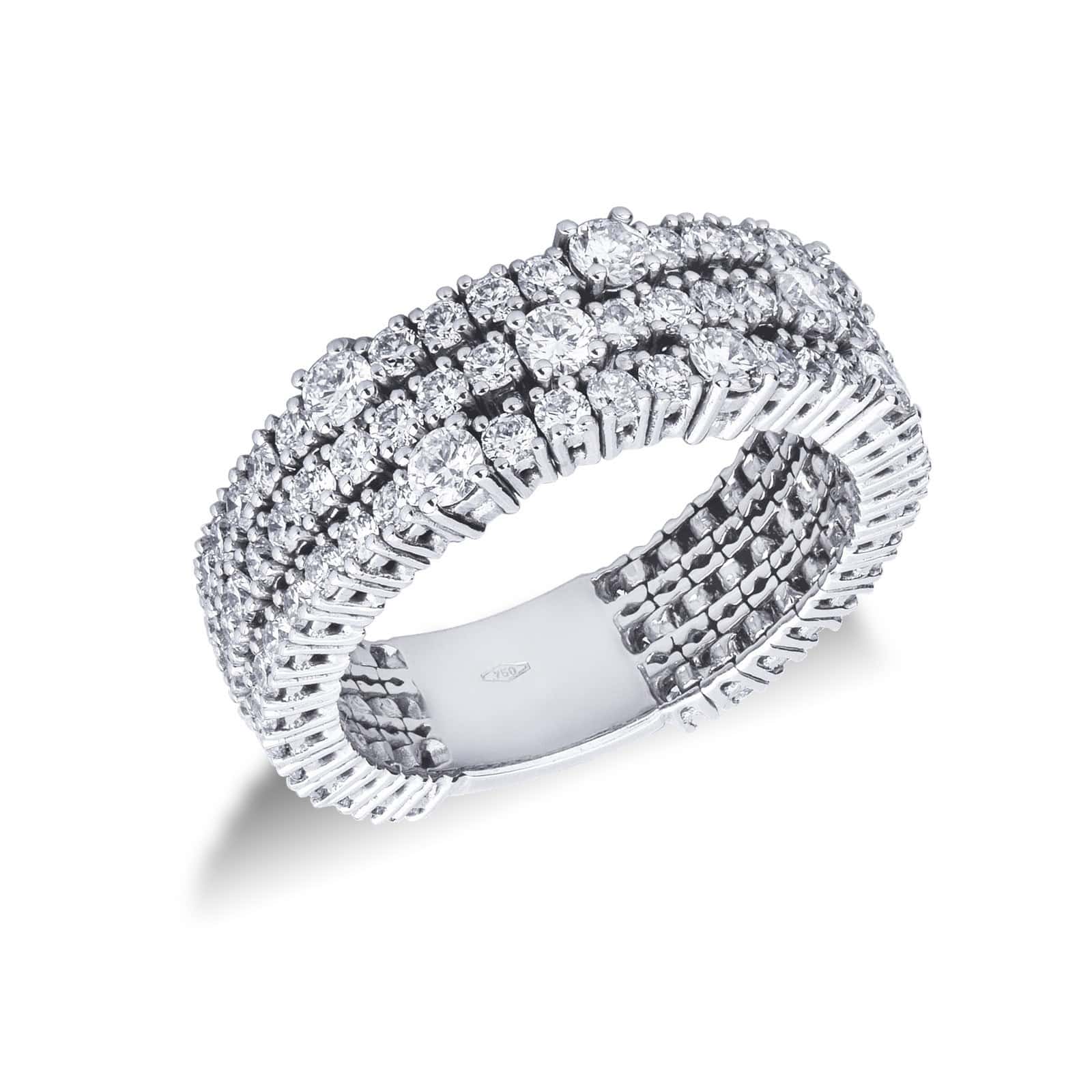 Anello a 3 file a griffe con diamanti bianchi e spot bianchi in oro bianco 18k
