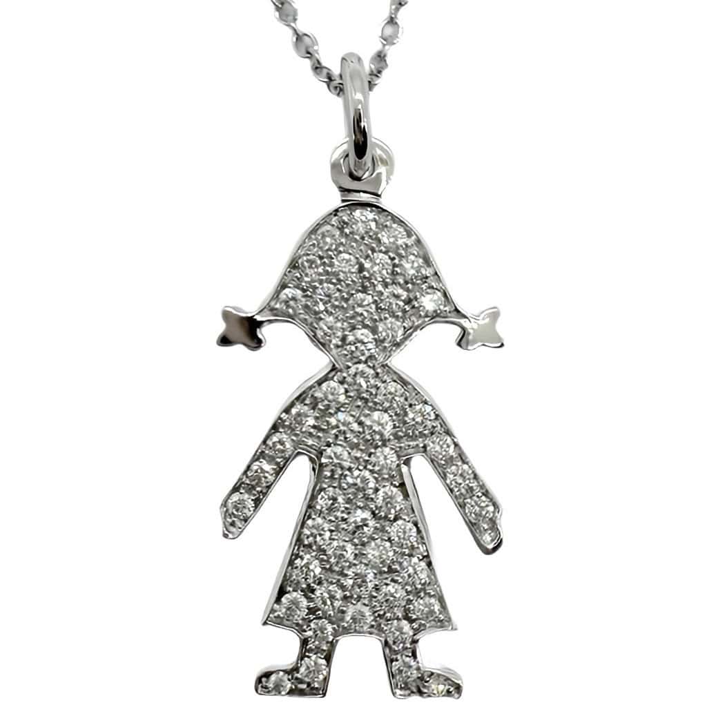 Un ciondolo in oro bianco a forma di bambina, un ricordo prezioso di un momento speciale per la famiglia. Il pavรฉ di diamanti bianchi che lo illumina, lo rende un gioiello elegante e raffinato, perfetto per celebrare la nascita di un figlio, un evento che cambia la vita per sempre.