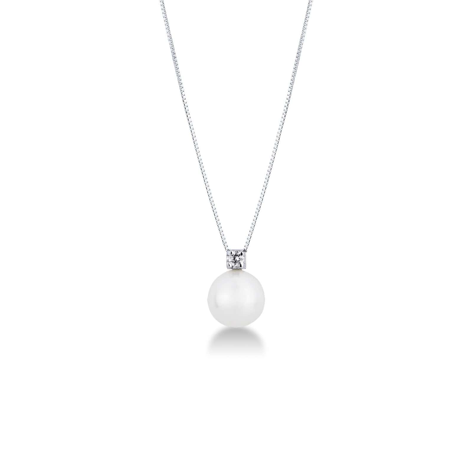 Collana in oro bianco 18k con perla di circa 8 mm e diamante